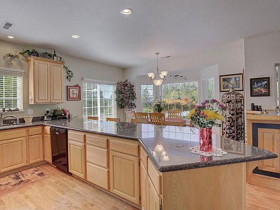 This home is gorgeous and so are the views! So well loved & loaded with many added amenities. To begin with, the spacious kitchen with panrty is really well designed with an undermount sink & huge granite breakfast bar for all your entertaining needs plus a dining area with views of the valley below. Appointed with 9' ceilings plus many vaulted ceilings & recent, solid oak floors, a comfy family room, plus formal dining / living room for even more entertaining. Grand Master Bedroom with roomy walk-in closet & spa-like bath with double sinks, shower & jetted tub. Beautiful, auto-irrigated landscaping outside, a huge covered rear patio with roller shades all around, stunning views & gorgeous, custom water feature surrounded by zero maintenance vinyl fencing. Tile entry, large laundry room with laundry sink & tons of storage, a 3-car garage plus side boat parking. Country atmosphere, yet less than 2 miles from town & minutes to the majestic Rogue River. Call for a look inside today!