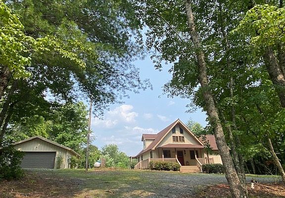PRICE REDUCTION: You want find a prettier setting for this 3/2 chalet style home sitting on 4.33 acres. Master bedroom on main floor with second bedroom upstaires with bath. Easy access with circular drive. Detached 2 car garage with large workshop in back and storage area beneath. One car carport on side of garage. Large wrap around deck with two covered porches. Hickory wood floors in great room and granite counter tops in kitchen. Go down to basement to two large rooms you could use for additional bedrooms, office, or craft room. Nice washer/dryer area. Mixture of pasture land and wooded areas. Great spot for garden. Septic system has been pumped. Roof only a few years old.