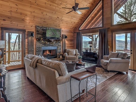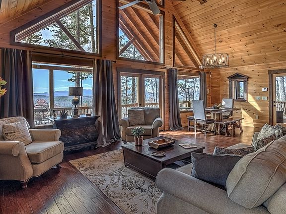 SPECTACULAR CABIN with SUCCESSFUL RENTAL HISTORY! AMAZING YEAR ROUND LAYERED MOUNTAIN VIEWS BACKING UP TO THE USFS! This 4BR/4.5BA Open Living/Dining/Kitchen with Cathedral Ceilings & Exposed Beams with Walls of Windows to soak in the LONG RANGE VIEWS! Oversized Master Suite upstairs with an Sunroom that would make an amazing office/reading area. Private Apartment above the garage with a kitchenette! Main level deck has plenty of space for seating by the outdoor fireplace or on the lower level for enjoyment in the hot tub. Large game room and Best of all it is FULLY FURNISHED! Conveniently located to Blue Ridge & Blairsville!