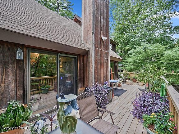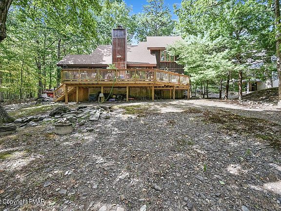3 Levels of Living in this 3 Bedroom 2 Full Bath Contemporary Saltbox Style Pocono Home nestled on a Peaceful .38 Acre wooded lot! New Roof with Warranty! New Front and Back Decks! Newly paved Driveway! Immerse in the wildlife from anywhere on this naturally manicured lot with Koi pond water features & Fire Pit! Inside offers Open Concept with Hardwood floors and Brick Fireplace. Primary Bedroom is on the main floor. Bring the outdoors in while enjoying the sunroom filled with natural light! Kitchen has plenty of cabinets and tile floor! Ductless A/C unit in the living room keeps the whole house cool! 2nd Level offers a Home Office adjacent to the 2nd Bed and Bath. Spiral Stairs leads to Loft Type 3rd Bedroom! Propane Heat Backup.