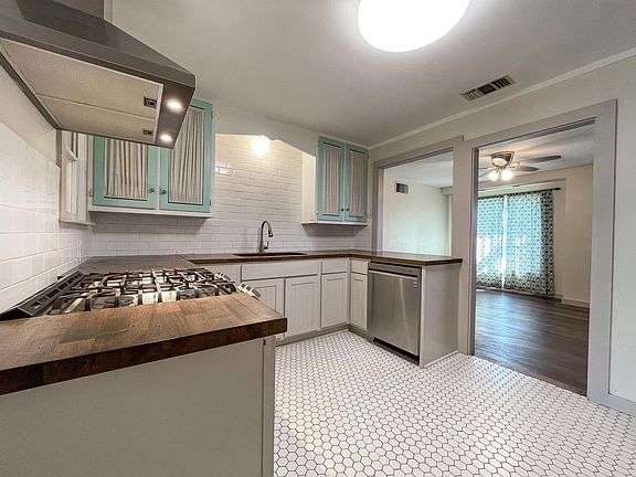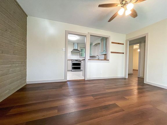 Charming 1950s home within close proximity to downtown New Braunfels. This home features stainless steel appliances and plenty of kitchen coutertop space. Enjoy good company outside in the spacious backyard. The back porch was closed in to add a bonus room with built in cabinets and a desk area. The garage was converted to create a primary bedroom and bathroom. Owner will allow small dogs under 30 pounds.