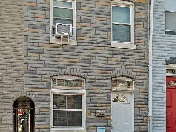 Charming 2-bedroom townhome in Fells Point, brimming with character! The entry door and front window boast beautiful stained glass transoms. The kitchen features warm wood cabinetry, stainless steel appliances, including a gas stove with a microwave range hood, and access to the back yard. The main level offers a convenient half bath. The upper level has a full bath with pretty tile flooring, 2 bedrooms, and a sitting area with built-ins, a hidden drop-down desk, and a decorative fireplace! The private rear yard features a lovely paver patio and is fully enclosed. Don't let the modest exterior deceive you, this home is spacious and full of natural light. Neutral paint and stunning original hardwood floors can be found throughout. Conveniently located near Fells Point, Canton, Patterson Park, and the waterfront. Don't miss the opportunity to make this wonderful home your own!