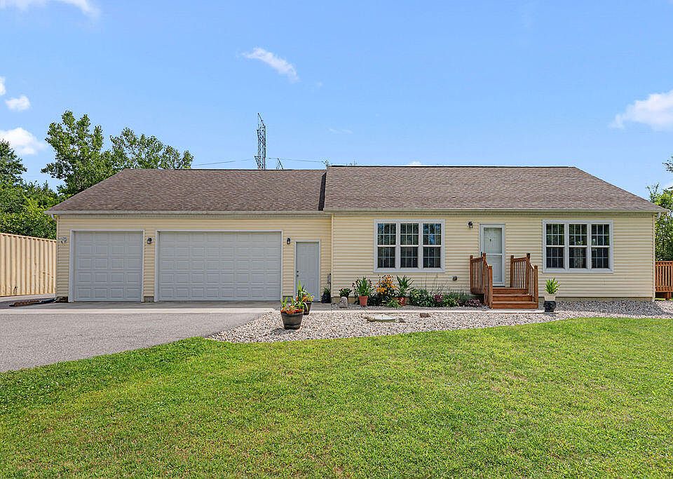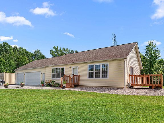 Unique getaway, open concept, Ranch home on 3.59 Acre tranquil setting surrounded by trees and teeming with wildlife. Public water and sewer. Huge 3 car attached garage and 40 foot storage container w/ electric. The home has many possibilities for expansion.