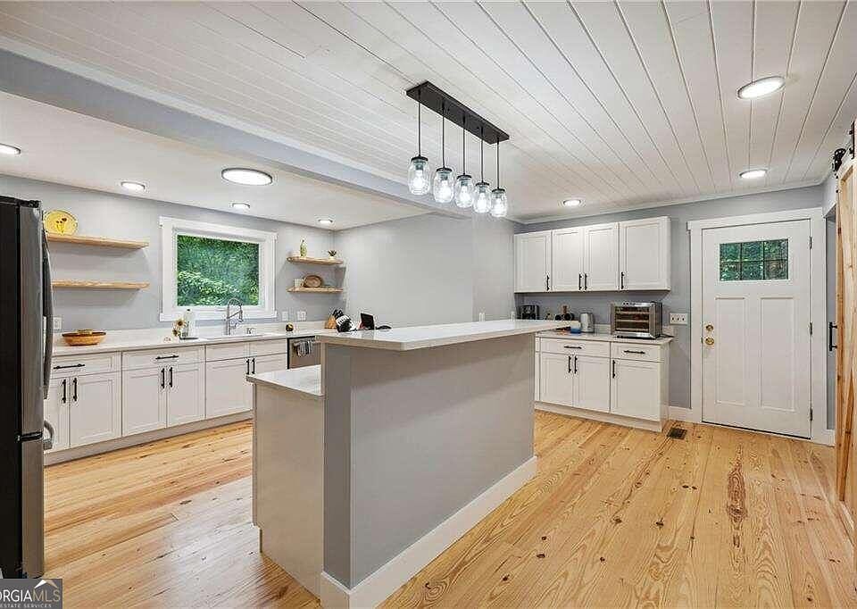 Discover your ideal mountain getaway in this stunning 3-bedroom, 3-bath cabin nestled on 2.79 acres of serene natural beauty. Massive deck, family room, gourmet kitchen, cozy primary suite, and terrace level with bar. Inside, the open-concept family room is highlighted by a cozy electric fireplace. Gourmet kitchen boasts sleek white cabinets, stainless steel appliances, and a convenient view of the family room. Dining area is adorned with floor-to-ceiling windows, allowing natural light to flood in. On the main floor, the primary bedroom serves as a tranquil retreat with an en-suite bath, complete with a beautifully tiled shower room. Terrace level adds even more living space with a welcoming bar, a large bedroom, and a full bath, perfect for guests. Step outside and fall in love with expansive deck where you can enjoy breathtaking mountain views. Property also features a charming chicken coop and a detached, spacious garage, adding both functionality and additional storage.