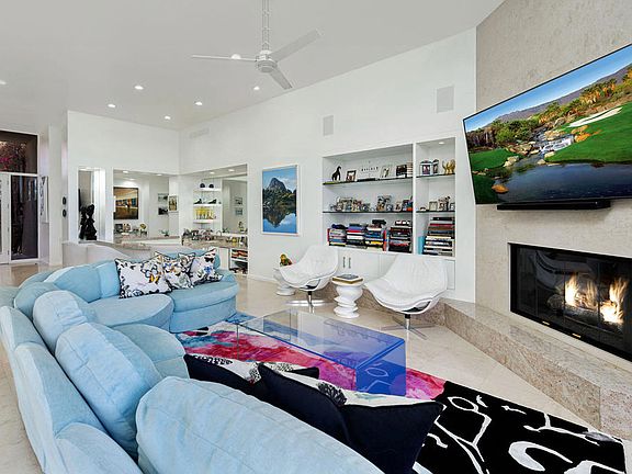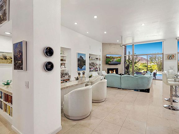 Welcome to your desert retreat! Located on the 12th fairway of BIGHORN's Mountain Golf Course, this home offers a Great Room concept with high ceilings and walls of glass. The main living area consists of living room, dining area, kitchen and wet bar. Separate den with views out to entry courtyard. Three ensuite bedrooms inside, with the master having access directly to pool, spa and outdoor living. A detached guest house includes full bath, walk-in closet, morning bar, TV and fireplace. Two areas to enjoy the sun, in the entry courtyard with water feature - and around the pool and spa with built-in BBQ center and fireplace. Listing price is unfurnished, but some furniture items may be negotiable.