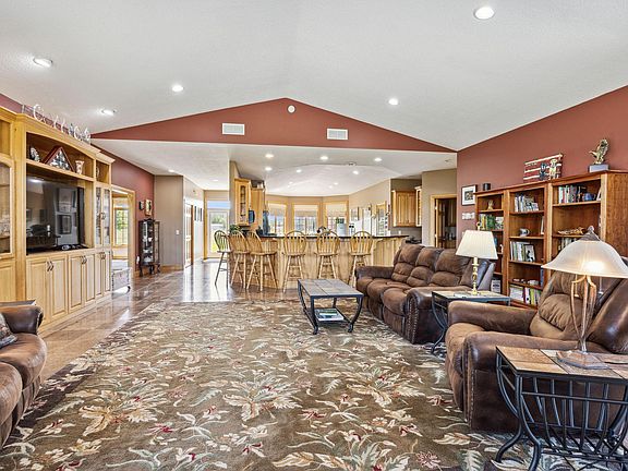 Welcome home to this wonderful 3 Bedroom/3 Bathroom rambler, all one level living, custom built home! Set back privately on 6 acres! Garage lovers! You have to see the 6-stall attached garage + Pole Building. Home has upgraded kitchen countertops, center island with Sink, Pantry, Tiled Floors, 9 ft. ceilings with Trayed ceilings in Living and Dining rooms, high end Anderson Windows and doors throughout. Exquisite master suite with Trayed Ceiling, Step down private bath suite was a huge walk-in shower and separate tub and walk in closet. The living room offers a large entertainment built-in and stone surround fireplace. The yard and landscape are completer w/irrigation system and stamped concrete patio, with new trees just planted. Garages are complete with floor heat, floor drains and 1/2 bath. Finished to be used as additional living space if you wish. Outside offers a 39x47 Pole shed finished with cement, insulation, power and lighting! NEW ROOF on home and 1 yr. HSA Home Warranty.