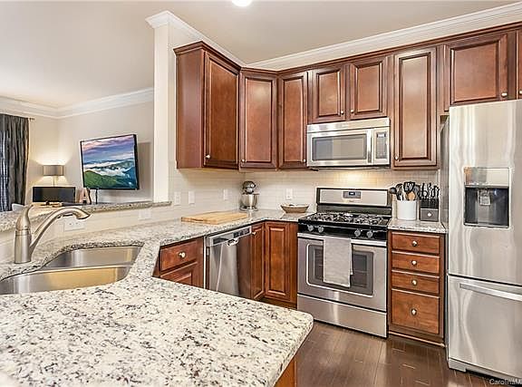 This beautifully updated Park South Station townhome features an open concept first floor with dining area, family room and kitchen with hardwood floors throughout. The kitchen features granite countertops, stainless steel appliances, subway tile back splash, under-mount sink and breakfast bar. Upstairs is complete with three large bedrooms and two full baths. The master bedroom has tray ceilings, ensuite bathroom and a walk-in closet. Park South Station is a well maintained and walk-able neighborhood with a fitness center, playground and pool and is conveniently located near I-77, shopping, restaurants and everything Southpark has to offer.