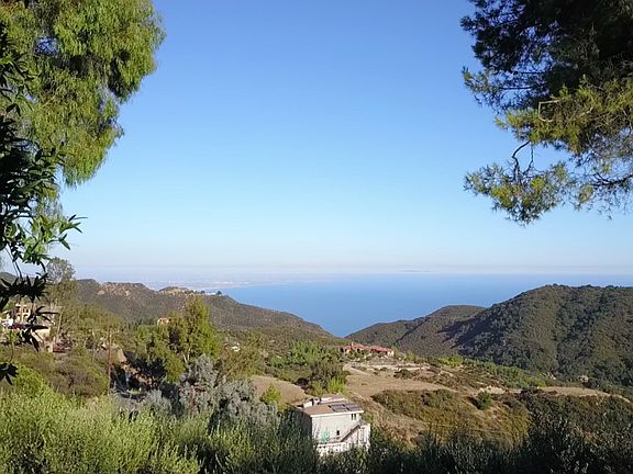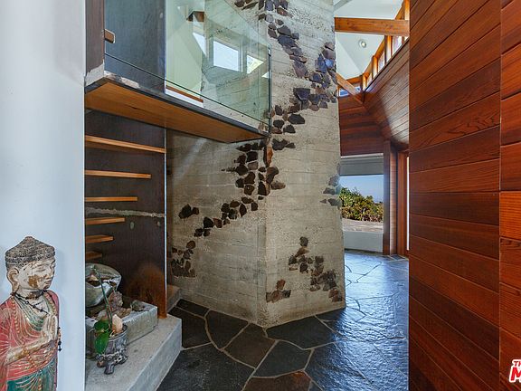 Mid-century architectural masterpiece. Massive ocean panoramic views from DTLA to Malibu. Live in paradise in a magical environment. Built by renowned architect Earl Wear, as his private estate. Indoor/outdoor living. Stone, slate polished concrete floors. Wood inlaid windows & doors. Custom fireplace intersects w/redwood beams. Floating wood staircase w/ steel and glass leads up to a loft w/360 degree views. Patterns of ironstone concrete create visual texture within unique octagon rooms. Lavish cooks kitchen, marble counter-tops, high-end appliances, vaulted ceilings, and abundant natural light. Fig, apple, pom & citrus fruit orchard. 900 square foot separate studio. Additional guest casita w/ocean views. Custom stone wall made of marble, onyx & crystals surrounds approx 1 acre of mostly flat land. Private & quiet. Easy PCH/Malibu/Valley access. Copies of architectural masterplans. Original, copper one of a kind roof. Space for horses & stable. Must experience.