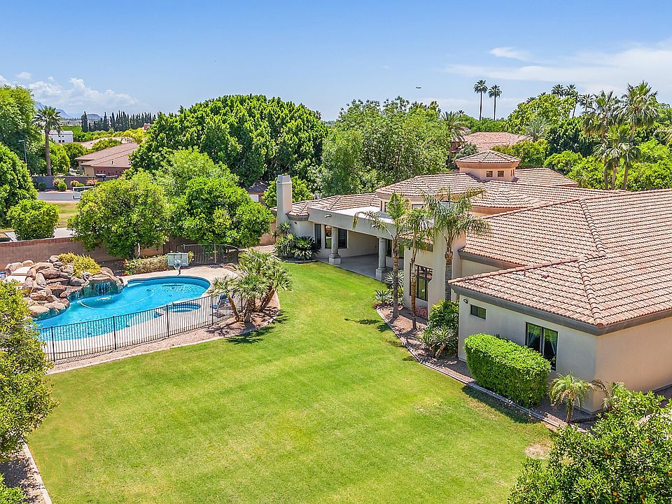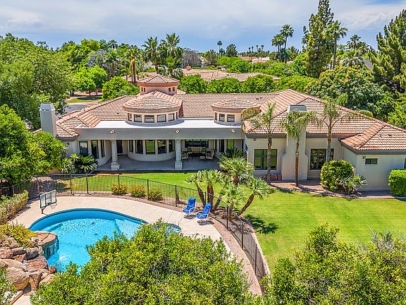 Indulge in a METICULOUSLY-CRAFTED CUSTOM ESTATE offering TIMELESS ELEGANCE in a lush citrus enclave. This AMAZINGLY ENERGY-EFFICIENT HOME is nestled in the privately-gated community of Vista Estancia, one of North Mesa's most coveted neighborhoods. Perfectly situated on a .81-acre lot, the home is surrounded by lush irrigated citrus, mature trees and features a paved circular driveway and huge grassy lot. The gorgeous back yard features an oversized north-facing covered patio with built-in speakers, and an EXTRAORDINARY FENCED POOL AND SPA, with ample room for laps, 10' deep for diving, and a stunning rock waterfall and slide. Cantera stone details embellish a high-quality colored stucco finish, and the custom entry door is timelessly elegant. Gracing over 5,600 sf of living space, interior features include limestone & travertine flooring, gorgeous Lincoln casement windows, soaring ceilings, and high-quality fixtures. Boasting the 'PERFECT' FLOOR PLAN,' the layout is appealing for many living situations. A TRUE SPLIT FLOOR PLAN, the Primary Suite occupies a separate wing of the home, with a spacious sitting room, romantic fireplace, and a well-appointed ensuite bath with abundant built-in storage and a spacious walk-in closet.