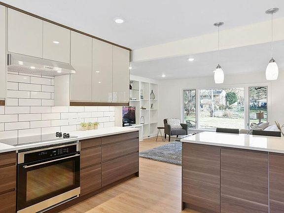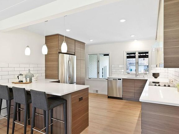 Like new mid-century rambler keeping the feel and character of the original home with the perfect touch upgrades. The absolute perfect home for entertaining! You won't find a home with this much space perfectly laid out! Grand formal dining area with fireplace! Main level laundry! Beautiful flooring consistent throughout the main level! Awesome cable railing and open stairway to lower level. 2 large bedrooms, bathroom with shower, 39 foot long family room with bar!Enjoy large kitchen with peninsula open to family room with lots of windows flooding with light. Huge master suite with large 9x8 walk in closet. Large bathroom with whirlpool tube! Nice touch with the pergola out front over patio area! 25 foot deck and large, flat, back yard, great for back yard games! Fantastic location just 10 minutes to down town and many parks and trails!