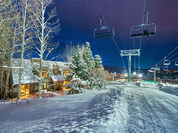 Positioned directly along the “Stampede” ski run at the midpoint of the Christie lift, 2440 Ski Trail Lane is a ski-in/out residence with direct access to the slopes of the Steamboat Ski Area. With only four homes in this discreet slopeside enclave, it provides both exceptional convenience and a sense of privacy that is increasingly uncommon so close to the lifts. The great room captures the spirit of the mountains with soaring, timber-framed ceilings and a floor-to-ceiling stone fireplace that invites gathering after a day on the hill. Three wood-burning fireplaces throughout the home add warmth and character, blending authenticity with comfort. The interiors balance natural materials with fresh, contemporary design. The kitchen features quartz countertops, stainless appliances, and an efficient layout that opens to both dining and living areas. Bathrooms offer modern fixtures and finishes, while air conditioning enhances summer livability. Five bedrooms, each with its own bath, provide abundant space for family and guests. The layout and unrivaled proximity to skiing makes this a promising short term rental property with excellent rental potential. Beyond the interior, a generous deck and private yard extend directly to the ski run, an unparalleled setting for morning departures, mid-day breaks, or evening relaxation while night skiing lights up the slopes. This residence embodies the essence of Steamboat’s mountain lifestyle: comfortable, inviting, and directly connected to the adventure unfolding just beyond its door.