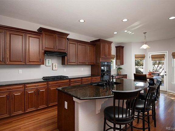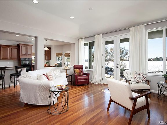 Open light and bright ranch w/ stunning golf course and mountain views. Nice flow on main level with extensive hard wood floors and grey/white paint tones throughout. Gas fireplace in great room with tons if natural light and glass french doors to patio. Ideal for entertaining with great room adjoining the gourmet kitchen featuring large island, cherry cabinets, granite counters and walk in pantry. Main level Master suite w/private patio access also boasts a 5-piece bath & walk-in closet. Secondary bedroom with bath and main level study. Wood floors throughout. Amazing backyard with views of mountain range and golf course and great location to enjoy community firework display and balloon launch. 3 car garage perfect for workshop or golf cart storage. Full unfinished basement great for storage or future finish!
