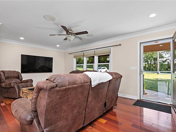 This stunning ranch is a definite gem with all the perks that will easily make you smile. It begins with a welcoming front entry leading you into an open concept floor plan. Enjoy the beautiful hardwood floors throughout the entry, living room, kitchen, and dining area. You will be impressed with the delightful kitchen that includes an island, deep sink, beautiful countertops, stainless steel appliances, and gorgeous cabinets. Reap the benefits of the spacious bedrooms with plenty of closet space. Spoil yourself when it gets a little chilly taking advantage of the heated floors in the stunning lower-level bathroom and laundry room. You will appreciate the three-car garage that will be all the space you need for large vehicles. No worries, you will have plenty of privacy on your 4.87 acres of land that includes an oversized deck and patio that will all be great for entertaining. Allow yourself to relax around the very nice fire pit as you treat yourself to many peaceful nights. Take notice of the chicken coop located on the property and the large outbuilding that will be all the storage space you need. You will not be disappointed because this home is an absolute treasure!