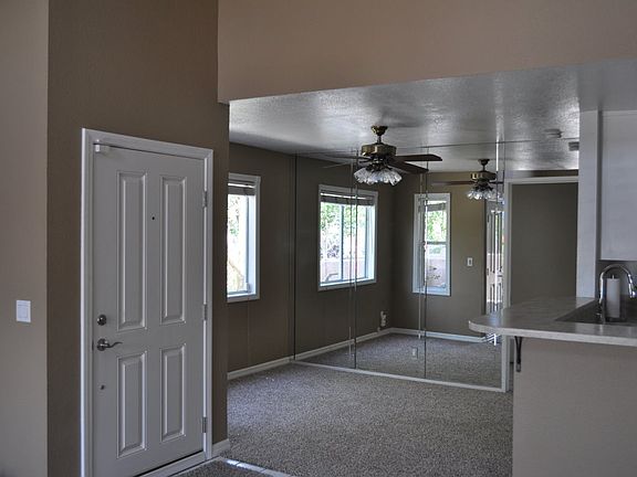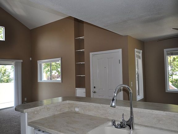 As you step inside, you'll notice the vaulted ceilings and ceiling fan, creating an airy and spacious atmosphere. The neutral carpet adds warmth and versatility to the living space. The kitchen features Corian countertops and white appliances, while the built-ins and pantry offer ample storage options.