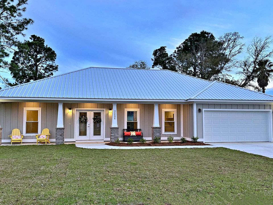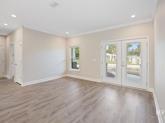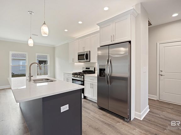 Beautiful new Gold Fortified construction located close to schools, shopping, restaurants and just a short drive to the beach! Open/split floor plan with high ceilings and recessed lighting, Lifelock vinyl flooring throughout. Kitchen features custom white maple cabinets (soft close), over/under cabinet lighting, stainless appliances, gas range, pantry and generous kitchen island with granite tops. Roomy primary suite offers a large walk-in closet, spacious bath with double vanities and granite tops, custom tiled walk-in shower with rain shower head. French doors with built-in blinds, oversized laundry room with utility sink. Low maintenance concrete board siding and metal roof. Zone X no flood insurance required! Transferrable termite contract. Neighborhood backs up to the Hugh Branyon Back Country Trail featuring seven trails spanning more than 15 miles with walkover to the gulf. Landscape package coming soon.
