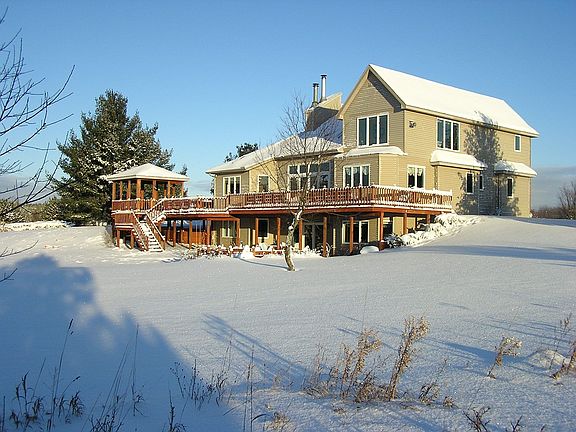 Outstanding in way of quality; perfect relative to presentation; the flow of the design and location could not be better! You will be pleased with the many details of construction beginning with the tile inlay of the foyer flooring, the soaring ceiling height, curved staircase, floor to ceiling stone fireplace feature and beautiful maple flooring. The kitchen is beyond compare in both size and style; features include granite, quartz, walk-in pantry with frosted glass door, beautiful cabinetry (some with glass fronts, all with crown molding) ultra quality stainless steel appliances, dual Dacor ovens, 6 burner Dacor gas range, Kenmore Elite side by side refrigerator freezer, center island work space, Kohler porcelain farm style sink, separate prep sink and peninsula seating. This home is truly flooded with natural light from the many south facing glass doors, windows and skylights. Generous dining space, gorgeous living room, music room with french doors, main level bedrooms share a Jack and Jill style bath room. The family entry room is adjacent to the foyer and this space will make a terrific in-home office. The master suite is a sight to behold. It provides beautiful countryside views and the space includes a fireplace, dressing area, vanity with make-up seating, lighting and mirrors, walk-in closet, sauna, whirlpool tub for two and shower room with double shower head. The lower level walks out to south facing patio. The additional features on this level include kitchenette, game area, family room, library shelving, built-in entertainment center, bedroom number 5, bathroom number 3, terrific laundry has tile floor, built-in cabinetry and granite countertop. There is a large fitness room with mirror covered walls. The deck stretches the length of the home and provides a shade gazebo at the west end. The front entry is a brick piazza style patio and there is a 30X50 2-story storage building in addition to the 2 car attached garage that is interior drywall finished.