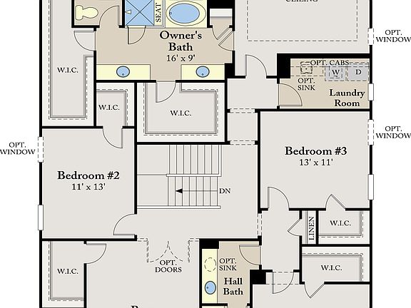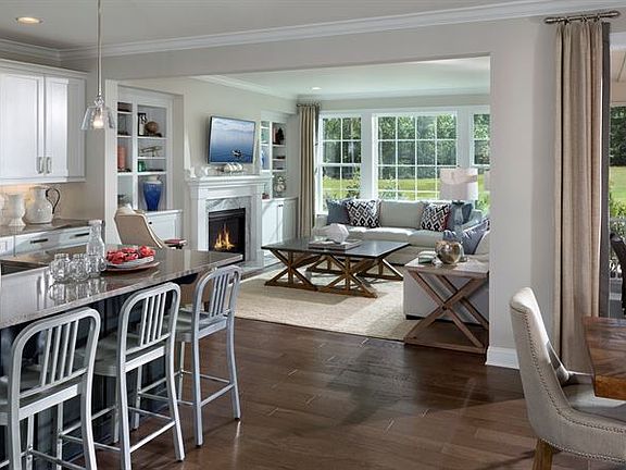 In the Monaco's casual design, the foyer leads directly to a breakfast nook and adjacent island kitchen. From the kitchen, with maple cabinetry, granite countertops, and Whirlpool appliances, an optional butler's pantry can lead into the formal dining room. Opposite the kitchen's island, a Great Room opens to an extendable covered patio. The spacious Great Room can also accommodate a side fireplace. With flexible square footage from 3,342 to 3,880, the design offers four to five bedrooms and 2.5 to five baths. The downstairs flex room can be converted to a guest suite with its own full bath. Upstairs, the lavish owners suite, with a laundry room conveniently adjacent, features a garden tub, tiled shower, and cultured marble vanities. A fourth bathroom can be added to the bonus room, with a staircase option for additional storage.