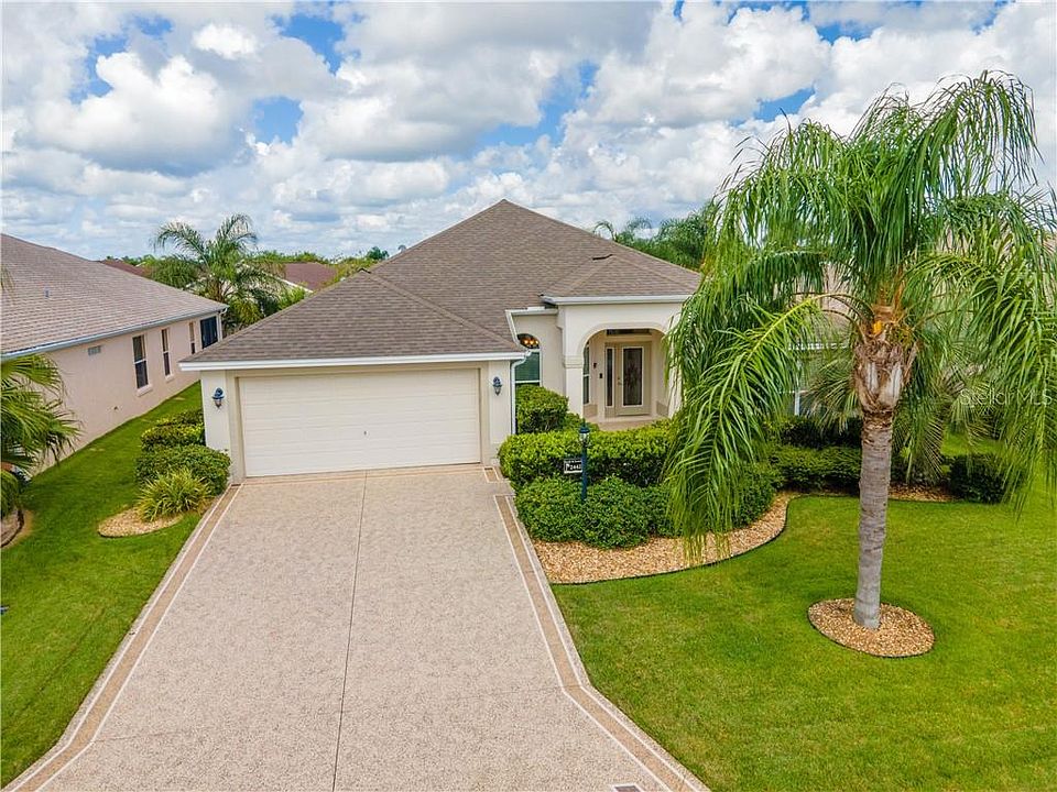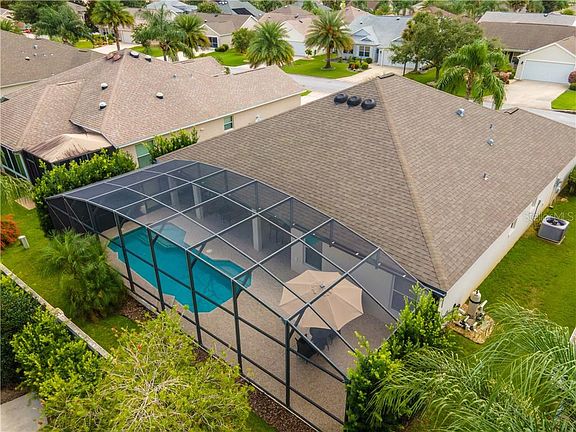 This beautiful Gardenia pool home will to brighten your day and is situated in The Village of Hemingway! You will be greeted with mature palm trees and hedges, rock landscape beds with concrete borders and the painted driveway. As soon as you open the front door, the pool with capture your attention! Stacking sliding doors lead to the lanai and pool beyond with mature landscaping on the outside and a courtyard villa wall for added privacy. The pool is 24 FT wide X 11.6 FT deep and a depth of 5 FT with 2 calming waterfalls and mesmerizing lighting for your evening swim. Outdoor entertaining will be a pleasure for you and your guests under the expansive screen enclosure. The home has engineered hardwood and tile flooring throughout, a split floorplan with a large open kitchen, breakfast nook, stainless steel appliances, high-definition counters with a bevel edge, pull-out shelves, a closet pantry and lots of counter space. The spacious master bedroom suite has a tray ceiling, sliding doors to the lanai and His & Hers closets. The master bath offers double vanities and a private commode with tiled shower. The laundry room has cabinets and utility sink. A pocket door to the guest bedrooms and bathroom is ideal for your visiting family and friends. The front bedroom does not have a closet. The Havana Country Club, Colony Cottage Regional Recreation Center and Shopping Plaza are conveniently located just minutes away by car or golf car. Call today to schedule a personal tour or view the virtual tour!