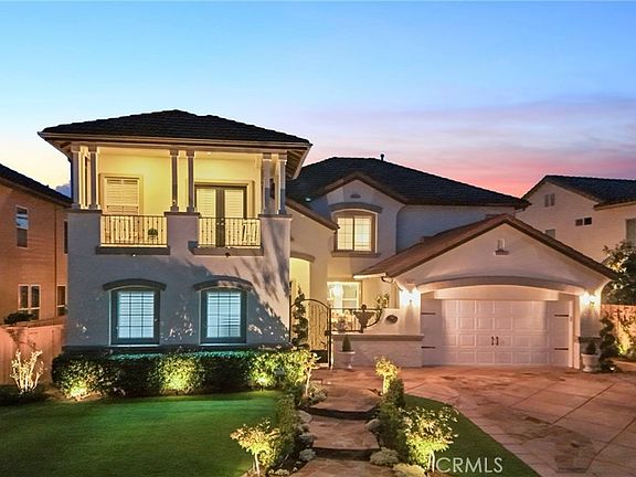 Unparalled Luxury in Serrano Heights! Experience uncompromised quality with sophisticated living in this meticulously upgraded 5 bed, 3 bath, 3,305 square foot designer home with breathtaking Catalina & city light views. Nestled on a single-loaded cul-de-sac this residence on a 6,523 sq ft lot features a split 3-car garage. Step into opulence: Restoration Hardware chandelier, luxury vinyl flooring, crown molding, and LED lighting enhance the grand entryway. The chef's kitchen is a culinary haven with Monogram appliances (column fridge/freezer, 6-burner range, Advantium oven), Best downdraft, Thermador beverage cooler, Shaws sink with Waterstone faucet, quartz waterfall island, marble backsplash, and custom brass/glass shelving. A custom dining counter features brass pendants. Luxurious retreats await: The master suite boasts stunning views, full wall moldings, and a spa-like bath with Kohler & Brizo fixtures, marble accents, a freestanding tub, and a lighted vanity. Upper bedrooms offer unique details like wainscoting and built-ins. A lower bedroom suite provides convenience. All bathrooms are gorgeous and feature upgraded fixtures beautiful shower enclosures and quartz counters. The laundry room has a quartz shelf and dog shower. Outdoor living is exceptional: Updated stone veneer, artificial turf, solar panels with battery back up, EV plug, gated courtyard with fountain, and a backyard perfect for entertaining with a pebbletec salt pool/jacuzzi with waterfall and baja step, covered patio with fan, and an 8-seater outdoor kitchen island. Other detailed property features include automated lighting, custom drapery, two fireplaces, upgraded garage with epoxy floors & built-ins, water softener, Emtek brass hardware, new Kohler toilets, and remote-controlled ceiling fans, quartz window sills and decorative window/wall moldings. Fabulous community with Low HOA dues and panoramic views to the ocean, Catalina and city lights.This home is superb in quality and offers a lifestyle of refined luxury.
