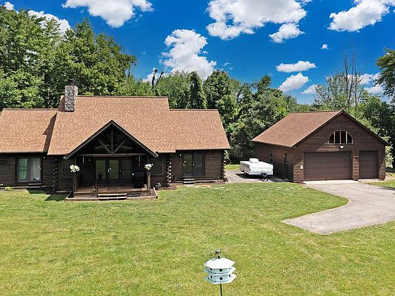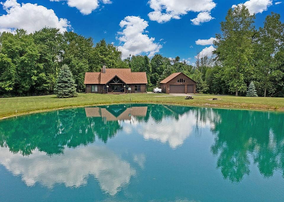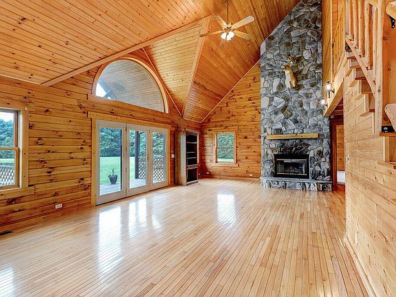 Beautiful retreat or everyday paradise? You decide! This stunning property with 8 acres (half wooded, half lawn) is waiting for you to enjoy! Beautiful stocked heart shaped pond out front is visible from almost every room in the house. Huge open floorplan has over 2200 square feet of space (PLUS1600 square feet of unfinished basement space). Enter the open plan kitchen with one (or 2) generous eating areas. Vaulted ceilings add tons of light to this log cabin home. All appliances (including washer/dryer) remain. Spacious great room has a floor to ceiling stone fireplace (gas logs installed or wood burning) and a set of doors out to deck. First floor also has half bath & the laundry w/ back door. Huge master w/ en suite, double closets & French doors facing pond. BR2, Loft + Full bath up!