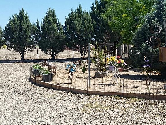 Enjoyable country living in Paulden. This 3 bedroom, 2 bath manufactured home with laundry room and Arizona room is a charming place to call home. A covered front and back porch with flagstone rear patio and sidewalk. Two car detached garage with work bench. This fully fenced property has rod iron and block to the front with 2 rod iron entrance gates. Circular driveway for ease of entering/exiting the property and plenty of parking for guests! RV hook up too! Guest gate at the front of the property. The side and rear fencing is wire. Plenty of room to entertain, garden or for kids to play. Landscaping, flower beds, fountain, and white picket accent fencing in the backyard. Open shed structure in the backyard. Beautiful sunsets!