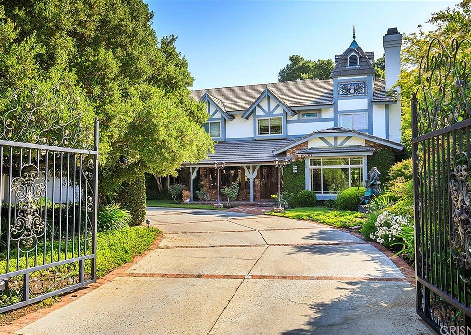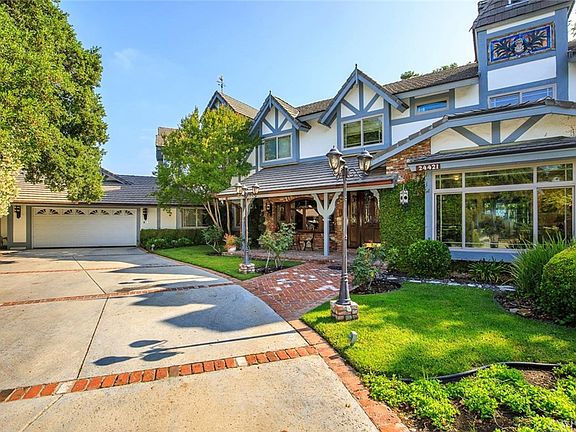 Pride of ownership emanates throughout this one-of-a-kind gated estate nestled on a tranquil cul-de-sac in Happy Valley! This stunning custom home boasts 4large bedrooms, 4 full baths (3 of which are ensuite) 2 half baths and 3 fireplaces. The dining room has a beautiful coffered ceiling, accommodates seating for 12, adjacent to formal living room & music room. The chef's kitchen has a commercial Wolf stove, large pantry, exquisite granite and wood countertops! The oversized laundry room connects to the 4-car garage! Just off the kitchen, a separate wing with complete en suite bed & bath, family room with stunning brick floors, French doors, wet bar & game room is an entertainer's dream! The handcrafted staircase is adorned with a stunning stained glass window & beautiful wood floors! The upper level boasts 2 bedrooms each with its own full bath, a large bonus room/library. The master suite is complete with sitting area, fireplace, office/safe room w/ separate entry. Master bath includes his & hers sinks, vanity, soaking tub surrounded by Roman columns & arches, walk-in shower and enormous walk-in closet w/ vanity. The expansive flagstone lot is shaded by oak trees. The backyard features a large sparkling pool, gazebo-covered spa, BBQ & low maint. landscape w/ fountain. Easy access to the 5 and 14 fwys. Close to award-winning schools, walking distance to fantastic eateries, shops, library, and Downtown Newhall. You will want to keep this home in the family for years to come!