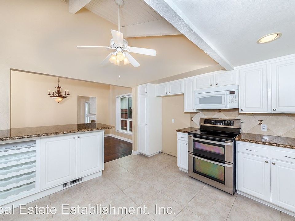 Well Appointed Lake Forest Single Family Home with Oversized Front Deck - This 3 bedroom, 1.75 bath Lake Forest home is spread out over nearly 1800 sq ft of living space on an almost 8000 square foot lot. Located close to shops, restaurants, and freeways this location has everything you could want. The property has been well maintained and upgraded. Upon entering the home, you will notice the sky high vaulted ceilings and rich engineered hardwood flooring throughout the living room, dining room, and family room. The dining room is open to the kitchen for easy entertaining. Kitchen boasts granite counters, marble tile back-splash, stainless steel LG double oven, peninsula with built in wine rack, and bright windows/sliding glass door facing the back yard. The family room has a wood burning fireplace with gas starter and easy garage access. All bedrooms have brand new upgraded carpet. The master has cathedral ceilings, a large sliding glass door to back yard, and en suite bathroom. Master bath includes over-sized shower with frame-less glass enclosure, granite vanity, and marble tile walls. The hall bath also offers marble tile tub surround and granite vanity. Bedroom #2 has custom built in double desk and cabinetry. Bedroom #3 has custom built chevron wood accent wall and mirrored closet doors. Exterior of home is updated with stack stone, upgraded lighting and newer paint. Large front Trexx deck with privacy wall. Private back yard with mature orange and lemon trees, string garden lights, and concrete patio. Dual pane windows and glass slider doors throughout. Central Heat and AC. Two car garage with remote opener. 12 month lease, 1 month deposit. Excellent credit and sufficient income required. No smoking. No Pets Allowed (RLNE2977415)