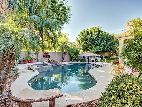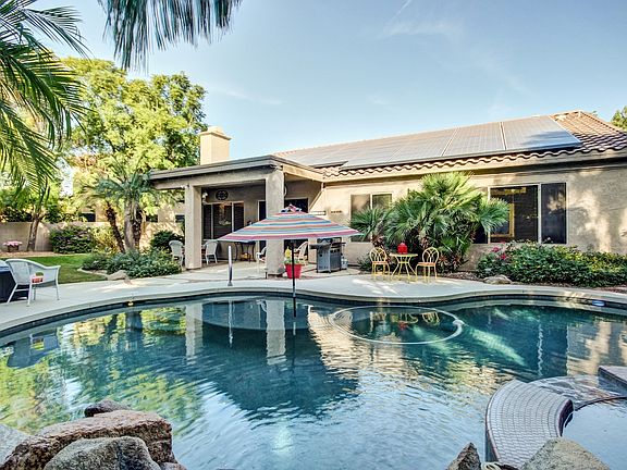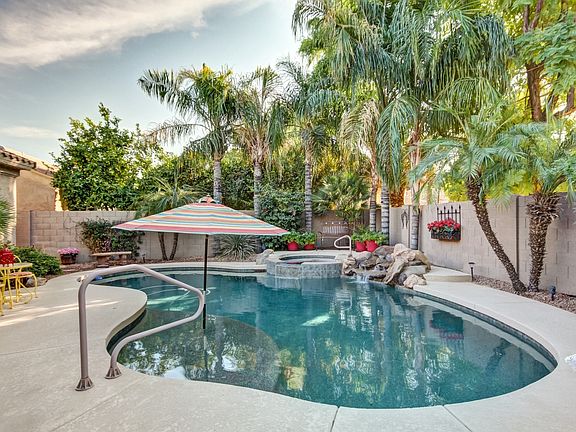 Outstanding Single Level Home with lush green landscape and exceptional backyard design!! Warm & welcoming palette, spacious open floor plan, beautiful tile floor set on the diagonal, plant shelves, gorgeous layered stone fireplace, and built-in media cabinets. Stunning chefs kitchen features center island, granite counters, breakfast bar, SS appliances, and wood cabinets. Perfect Home for entertaining inside and out. Plush carpet in all the right places, generous size bedrooms, ample closets, and 2 baths. Amazing backyard oasis with covered patio, refreshing blue pool that can be heated, spa, and lush green grass. A MUST SEE!