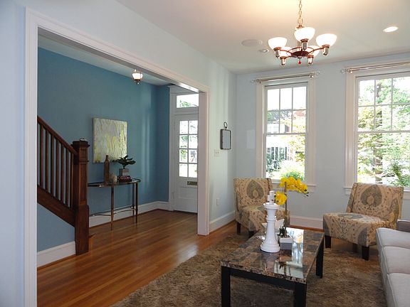 Total “to the studs” renovation in 2007 gives this fabulous Glover Park house new life, with many original wood features preserved, as well as significant modern updates. This home, on an exceptionally large lot with expansive backyard, is close to so many amenities. Original wood features include: door & window frames, stairwell & banisters, hardwood floors. Additionally, there is modern wiring for sound and other technologies throughout, as well as both central air & heating, not to mention premium GE appliances in the open, modern kitchen. Main Floor: Side Hall Entry via the welcoming front porch; coat closet in Hallway. Living Room with both recessed lighting and traditional arts & craft light fixture; custom Wet Bar with glass-front cabinets. Dining Room with tons of entertaining space opening to the Kitchen which has custom cabinets, island range & hood, eat-in bar, and stainless steel GE Monogram/Profile appliances: refrigerator with in-door dispenser, dishwasher, 36" range top and separate wall oven/microwave. 2nd Floor: Large Master Bedroom faces east for fabulous morning light! 15' x 14' with three large windows, ceiling fan, and media /linen closet--more spacious than most row houses offer. Don't forget the two organized walk-in closets! Master Bath has large custom jet tub and Restoration Hardware elements, as well as built-in speakers. Upstairs Laundry has updated skylight, plus Elfa shelving and more for all your laundry/storage needs. Front Room can be a bedroom, den, office, etc. With its vaulted ceiling, exposed original beam, ceiling fan and extra high windows, you'll enjoy the last afternoon light on the block in this unique space. Lower Level: Front Door Entry into the perfect Rec Room, ideal for entertaining your friends! Nicely maintained flooring, an under-stair wine cellar, plus an extra refrigerator complete the perfect entertaining space. Full Bath with walk-in shower and heated floor. Rear Bedroom with Elfa closet system and wall of windows opens to a private rear patio, completing this unique basement space. Two extra storage closets. Utility Room. Exterior: Much larger lot than one expects in the city, plus a garage! Front yard has Japanese maple tree & mature plantings; front entrance to Basement and Front Porch. Large rear Deck off of Kitchen, large rear Patio under Deck, mature bushes and plantings, slate walkway, deep rear yard (81 ft), garage. Highlights: Modern wiring throughout, including for sound, with Polk speakers in most of the house, Ethernet & phone cabling in walls. Elfa shelving in 4 closets and Laundry Room. Restoration Hardware fixtures throughout much of the house. GE Monogram kitchen appliances. Central HVAC. Huge lot with mature planting and garage. Convenient to Wisconsin Ave. and it's amenities, transportation.