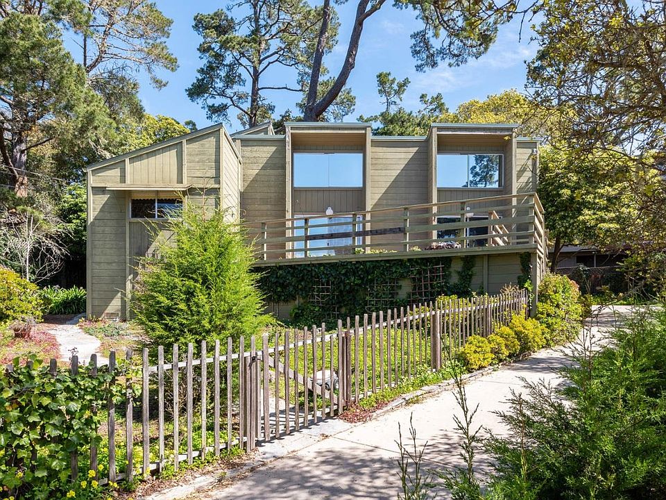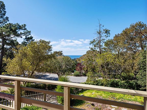 Upon entering one will be see the potential with the high ceilings in the entryway and open living room. The views of the blue ocean towards the large deck is mesmerizing. A ground floor master with large sliding doors to the western facing deck. Two bedrooms upstairs and bathroom. A large lot that basks in the southwestern exposure of Carmel Woods is prime for a perfect garden. This home is ready for great indoor/outdoor living and entertaining.