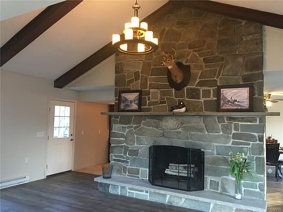 Overlooking the lower reservoir this 3 bedroom ranch provides one floor living with an open floor plan. Large living room with cathedral ceiling and woodburning fireplace, updated kitchen with tile backsplash, recessed lighting, and an indoor charcoal grill! Large master bedroom and 2 others each with it's own full bath, and let's not forget the office for all of your work from home needs. The deck overlooks the water view, detached garage. Deeded use of the wide trails through the woods behind the property to use the PRIVATE LAKES located behind the property. Great place to entertain or staycation and relax!