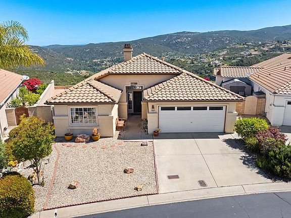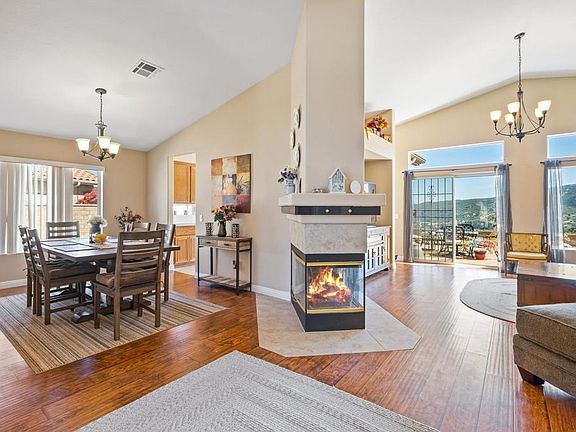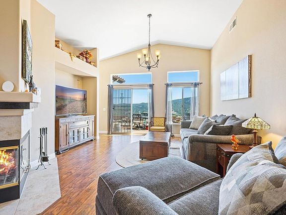VIEWS, VIEWS, VIEWS! This beautiful, single-level, home is located in the highly sought-after Crown Hills Community of Alpine and features 3 bedrooms, 2 full bathrooms, and is 1,658 sqft. Amazing features throughout include vaulted ceilings, wood flooring, dual pane windows, forced A/C & heat, and a two-car garage. The cozy fireplace is centrally located at the corner of the living room and dining room creating the perfect atmosphere for entertaining. The kitchen hosts an eat-in dining nook by the window to enjoy the view, stainless appliances, loads of cabinetry, and a walk-through entrance leading into the formal dining room. The spacious primary suite includes a walk-in closet with a sliding door to the exterior of the home and a comfortable patio. The primary bathroom hosts a dual vanity and a separate tub and shower. The spacious private 2nd bedroom is on the opposite side of the home and the 3rd bedroom is off the living room and is currently used as an office. Surrounded by a low maintenance yard, brick fencing, and concrete patio with a panoramic view! Community amenities include a clubhouse, rec room, tennis/pickle ball courts, pool, spa and RV parking. All this with a low HOA fee of $215 per mo. Don't miss out on this amazing chance to call this amazing place home!