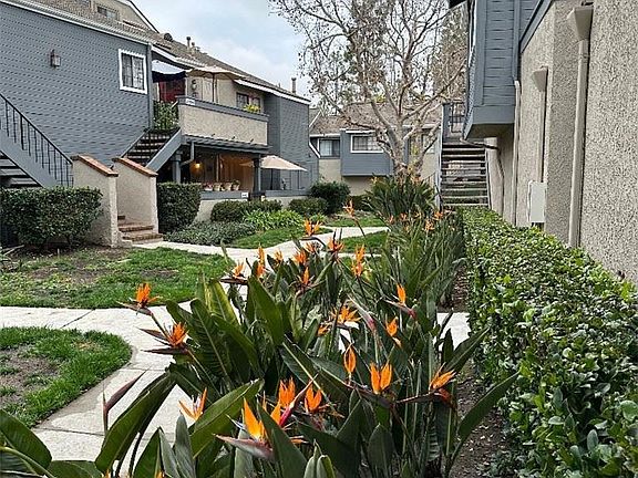 Price reduced for this highly desirable end unit located in the gated community of Village Terrace II. Upper level unit has a picturesque view of tropical plant and trees! lush foliage. Very quiet and charming! This unit boasts two bedroom and 2 baths with a single detached garage.Kitchen features upgraded quartz countertops with plenty of cabinetry for storage. Free standing range/oven with microwave. Laminated wood flooring throughout. Patio area is upstairs with plenty of room for entertainment. Great location with community pool and spa. Minutes away from beach, major shopping centers and freeways.