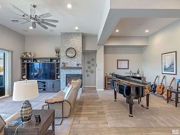 This stunning single-story residence offers the perfect blend of luxury and comfort, designed for those who love to entertain and relax in style. The outdoor oasis features a covered patio with a built-in BBQ, ideal for year-round gatherings, and an in-ground swim spa and a hot tub for ultimate relaxation. Step inside to discover an open floor concept with high ceilings, ceiling fans, and a floor-to-ceiling stone-stacked fireplace that serves as the focal point of the living area., The spacious and inviting layout creates an airy and expansive feel throughout the home. The master suite boasts a luxurious bathroom with a large walk-in shower, custom tile, and intricate lighting. Functionality meets elegance with ample storage space throughout the home. The garage offers plenty of storage options and features a sleek, durable epoxy floor. Additionally, there's an outdoor storage shed for all your outdoor equipment and tools, as well as extra shelving inside the pantry. The kitchen is a chef's delight, featuring a massive island with storage underneath, perfect for all your culinary needs. This home is a rare find, offering exceptional features and a thoughtful layout that caters to both entertaining and everyday living.