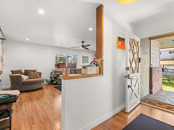 Welcome to Your New Home! Nestled on a quiet sidewalk street, this charming home features a front yard adorned with trees, turf grass, and low maintenance landscaping. The formal entry leads into a spacious living room that seamlessly flows into the dining area with sliding doors that open to the back deck with peek views of Mt. Miguel and Mt. Helix. Enjoy modern comforts with recessed lighting, dual pane windows, central heat, cold AC, and new floors in the living room, hallway, and bedrooms. Two bedrooms boast dual closets for ample storage and the primary features an updated bathroom. The generous backyard has many opportunities to delight in with fruit trees and designated garden areas. Additionally, a versatile 10x15 bonus basement room provides the perfect space for an office, workshop, or extra storage. Plus, enjoy the convenience of direct access from the two-car garage to the house. Your new home is waiting for you!