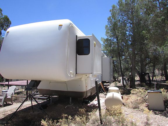 This very private 13+ acre lot features panoramic views and is heavily treed with Pinon Pines and Juniper. There is a 2600 gallon water tank which is gravity fed. Septic system is already installed. Generator for power. Leased propane tank on site. Dog run and entry platform are staying. Storage shed. Several level locations for family and friends to park their travel trailers. Large immaculate 5th wheel does NOT convey with property but is available for sale. This is an ideal property to beat the heat!