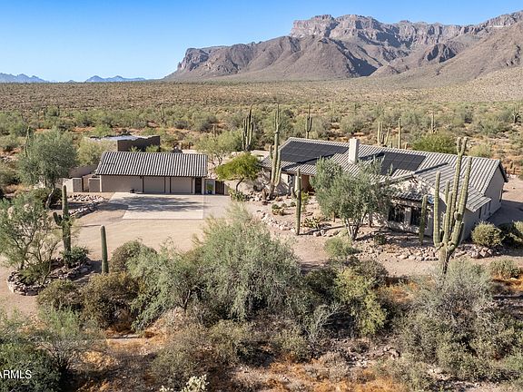 You can Own your Own Piece of Paradise w/ Panoramic Views of the Superstition Mountains...This Custom Home is Built on 2.5 Acres & Borders the Superstition Wilderness! 3310 sqft consists of Owners Suite w/ Sitting Area, 2 Split Spacious Bedrooms & 1 Bonus Rm/Casita w/ Full Bathroom. Gourmet Kitchen w/ Custom Cabinetry, Subzero Fridge & Solid Surface Countertops. Great Room Floor Plan w/ 10 Ft Ceilings & 8 Ft Doors. Large Laundry Room w/ a Huge Pantry! 3 Full Bathrooms & Spacious Closets. Refreshing Diving Pool out Back, Two Walk-in Storage Sheds, RV Gate & Side Yard for Trailers, Boats, & Toys! Oversized 2.5 Car Garage along w/ Huge Workshop. Plenty, Plenty, of Parking! New Roof, HVAC, & Windows. Wall of Windows to take in the Spectacular View of the Superstition Mountains. Welcome Home! It boasts a pantry and abundant wooden cabinets, complemented by a tile backsplash and gleaming counters. The peninsula, equipped with a breakfast bar, makes mornings delightful. Retire for the night in the generously sized main bedroom. The room offers sufficient space for a quaint sitting area, making it an ideal relaxation spot. The chic ensuite features dual vanities, a lavish shower, and a spacious walk-in closet, ensuring your belongings are organized and easily accessible. But the beauty doesn't end indoors. The backyard is an entertainer's dream, presenting a covered patio ideal for alfresco dining, a built-in BBQ for weekend cookouts, and stylish paver seating areas. Dive into the shimmering pool on warm days or relax in the above-ground spa as you soak in mesmerizing sunset hues and breathtaking mountain views. With so much to offer, who could resist calling this place home? Experience unparalleled living in this exquisite abode!