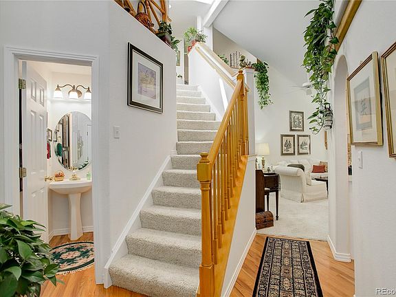Walk into bright open cathedral ceilings. The great room off of the kitchen features an easy-to-use gas fireplace to add ambiance or warmth. The patio backs to a green belt. Enjoy low maintenance living while the HOA takes care of the common grounds and even the front yard. Easily access the spacious primary bedroom and laundry area located on the main level. You'll love the large ensuite bathroom featuring double sinks, separate shower and bathtub, a private commode and walk in closet with built-in cabinets. The custom tile work on the bathroom floor and laundry area is gorgeous. A 2-car attached garage has plenty of shelves for storage and is essential to protect your car in inclement weather. The views of your home can be particularly enjoyed as you walk to the top of the stairs. You'll notice the loft area which could be tailored for any number of uses such as an additional bedroom or office. A full bathroom upstairs goes great with the spacious second bedroom featuring two walk-in closets! The large unfinished basement offers even more storage room or additional living space for your creative visions. The pride of ownership is evident in this neighborhood with these beautiful and well-maintained homes. You'll have close highway access and the community lies within the award-winning Cherry Creek School District. We're excited for you to see this home in person and fall in love with it.