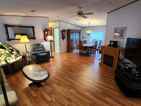 THIS IS A MUST SEE! MANY PERKS! FENCED IN YARD, 12.5' X 34' SHED WHICH COULD BE CONVERTED TO GARAGE, SPRINKLER SYSTEM WITH WELL, UPDATED PLUMBING & ANCHORS, WATER HEATER 2024, LAMINATE FLOORS, LARGE FRONT ENCLOSDED PORCH WITH VINYL WINDOWS, OPEN FLOOR PLAN. YOU OWN THE LAND! LOW HOA WHICH INCLUDES CABLE TV AND INTERNET, 2 HEATED POOLS, 2 CLUBHOUSES, TENNIS COURTS & STORAGE FOR RV'S FOR SMALL ADD'L MONTHLY FEE DEPENDING ON AVAILABILITY. 2 PETS ALLOWED.