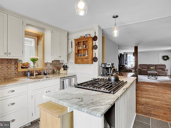 This historic home with great character and many original features is a “colonial log cabin” located at the very heart of the Village of Stony Run. In addition to the home and it’s postage stamp yard and additional land, the property also features a 2 car deep carriage/barn styled electrified garage with work bench. The Kitchen has been completely renovated with lots of new custom cabinets, a peninsula cooking station, stool seating, new tile floor, tin ceiling back splash, a 3 shelf Kitchen Aid dishwasher, Whirlpool stove/oven, Maytag refrigerator/freezer and a newly installed kitchen sink window. The second level houses 2 bedrooms, a center hall and the full bathroom. The beauty and the craftsmanship of the second level competes with all the other areas of the house. Note not only does the 2nd level have the same original 20 light windows and original wide plank floors but it also has the original exposed and beamed wood ceilings throughout. Like the other staircases, this staircase is the original wood one. At the base is a landing behind the original wood door to the enclosed staircase with limited custom shelving above the landing. As with the other staircases there is the same floor to ceiling original 20 light window; this one though with a custom wide slatted wood blind. The 3rd level is “great space” and most unexpected,Previous owners have used it as a Master Bedroom. It has a separate thermostat and has a stand alone European Style vented air conditioning system.