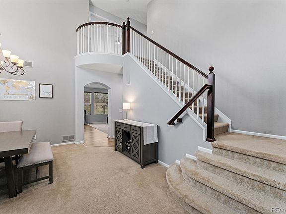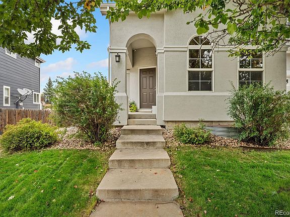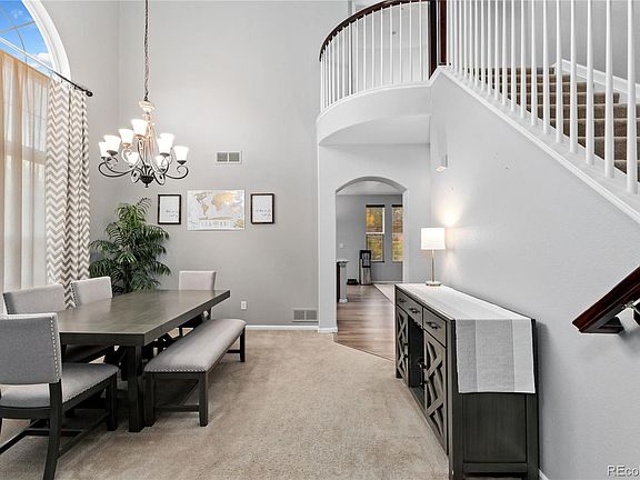 Magnificent two-story residence in Sterling Hills! An abundance of natural light fills the space and is accentuating by double-height ceilings that create an inviting atmosphere. The main floor boasts a seamless flow from the grand entrance to the formal dining space, complemented by new luxury vinyl plank flooring in the kitchen. The kitchen is a culinary enthusiast's delight featuring stainless steel appliances, 42-inch cabinetry, recessed lighting, an island, and ample eat-in table space. The extended living room offers a cozy retreat. A convenient main floor non-conforming bedroom/office/flex space with beautiful historical antique door is perfect for working from home or using as a guest bedroom when family visits - just add a wardrobe or closet. Venture upstairs to discover three generously sized bedrooms, including a primary suite that exudes luxury. The primary suite features a bonus sitting room and five-piece bathroom, offering a serene escape from the day's hustle and bustle. The upper level also hosts a spacious laundry room and a well-appointed bathroom with dual sinks. The unfinished basement provides room to grow in the future. Practical features such as the epoxy garage floor, new roof, and newer HVAC system add to the home's appeal. Situated atop a hill, the backyard boasts a three-tiered terrace and is surrounded by various trees that create an unparalleled sense of privacy. Imagine relaxing on your patio, enjoying the tranquility of your surroundings and nature's beauty. Sterling Hills is conveniently located near Southlands and Aurora Town Center, both offering a plethora of community events and fantastic dining options. Nature enthusiasts will appreciate the proximity to the Plains Conservation Area, where encounters with pronghorns and great-horned owls await. Within walking distance, you'll find a charming park as well as the incredible Great Plains Park, complete with two playgrounds, splash pad, and a baseball field. Welcome home!