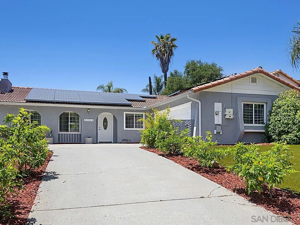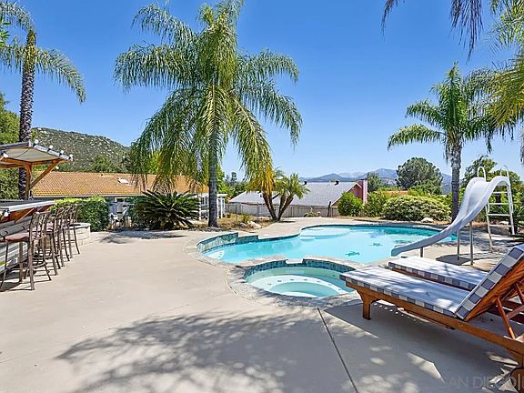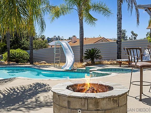 Welcome to your dream home in the picturesque San Diego Country Estates of Ramona! This stunning single-story residence boasts 3 spacious bedrooms and 2 bathrooms, offering an open floor plan that is both bright and inviting. Step into the heart of the home where the large kitchen awaits, featuring exquisite granite countertops, a convenient breakfast bar, and top-of-the-line stainless steel appliances. Outside, your private oasis awaits. Dive into the custom pool complete with a fun slide and a soothing jacuzzi, or gather around the two outdoor fire pits for cozy evenings under the stars. Poolside and lower-level firepits provide versatile options for ambiance. The front yard boasts turf landscaping, ensuring easy maintenance, while mature palm trees enhance the tropical feel throughout the entire property. Portions of the backyard also feature turf, creating a beautiful, low-maintenance landscape. Living in San Diego Country Estates means access to an array of exceptional amenities. Enjoy two community pools, concerts in the park, a clubhouse, and a golf course. The area also features numerous parks, horseback riding trails, tennis courts, and a vibrant calendar of community events. This home is not just a residence, but an entertaining escape where memories are waiting to be made. Don't wait to experience all this exceptional property and community have to offer!