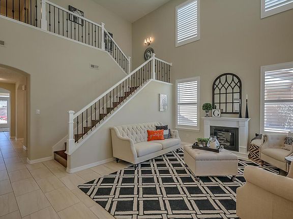 This beautifully updated home has modern tile floors downstairs and wood floors throughout most of the upstairs. A soaring ceiling in the living area shows off the decorative fireplace and iron-spindle banister staircase. The large family room is open to the breakfast nook and spacious kitchen with granite countertops and island. Formal dining room, too. The master bedroom is roomy with a master bath containing a separate shower, garden tub and walk-in closet. Then there is the wonderful backyard with a pergola, pool w/integrated hot tub and fire pit for entertaining your guests. Lastly, the tandem, 3-car garage gives you plenty of room for your toys. Plantation shutters throughout the entire home help you control the light and atmosphere along with the refrigerated air conditioning.