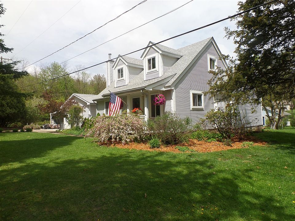 Charming cape cod home with extensive landscape, fruit trees, grape vines, gardens & more await your family! Well maintained country home with concrete drive & sidewalks. Welcoming covered front porch & beautiful leaded front door lead you into open & spacious living areas. Living & dining rooms have hardwood floors. Nicely updated kitchen with Quartz counters, under cabinet lighting, stainless steel appliances, ceramic tile black splash & flooring. 1st floor master bedroom & laundry. 2nd floor with 2 more bedrooms & full bath. Enjoy relaxing on covered back deck overlooking your oasis. 2 garages both insulated, finished, heated with 220 service for your hobbies. Hoop house & garden shed ready for the growing season.
