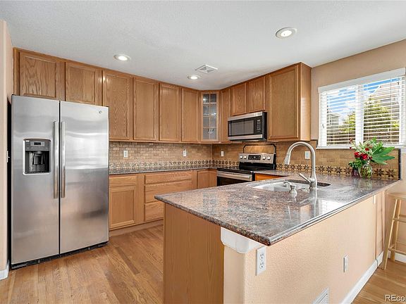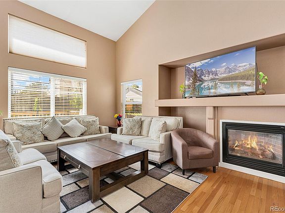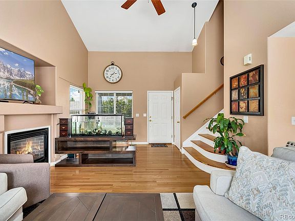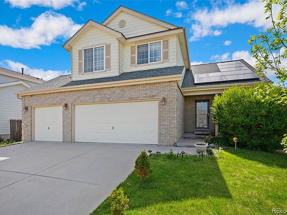 Nestled on a quiet street in the desirable Sterling Hills community, you don't want to miss this inviting 2-story home with a 3-car garage! Natural light abounds throughout the inviting interior and is accented beautiful hardwood floors, a cozy fireplace, and a soaring vaulted ceiling. Ideal for entertaining, this home offers a spacious open concept living room, dining room and kitchen. The kitchen delights with beautiful granite countertops, a peninsula island for extra seating, pretty tile accent backsplash, and stainless steel appliances. Enjoy dining al fresco on a summer day on the sprawling backyard deck that is accessed off the dining room via a sliding glass door. The deck in turn opens out to the private fenced backyard that has a nice yard ready for play, and garden areas along the back and side ready for planting! The second floor hosts 3 generous-sized bedrooms, all with hardwood floors, including the primary suite that boasts a 5-piece bathroom with new mirrors and a walk-in closet. The recently refinished basement offers an excellent rec room enhanced with easy-maintenance vinyl plank flooring, and a convenient ¾ bath. Energy-efficient solar panels help keep energy bills low! Newer washer and dryer and mirrors in baths. Attached backyard storage shed is perfect for housing the lawnmower and outdoor tools. Recently repaired front concrete steps with warranty. Great location just a block from Great Plains Park and Conversation Center - a nature preserve and educational center that encompasses over 1,100 acres of short grass prairie with breathtaking views of the Rocky Mountains and trails to explore. Just minutes to E-470 for painless commuting, and close to shops, eateries, and Central Recreation Center. This move-in-ready gem is a must-see and ready for you to call it home!
