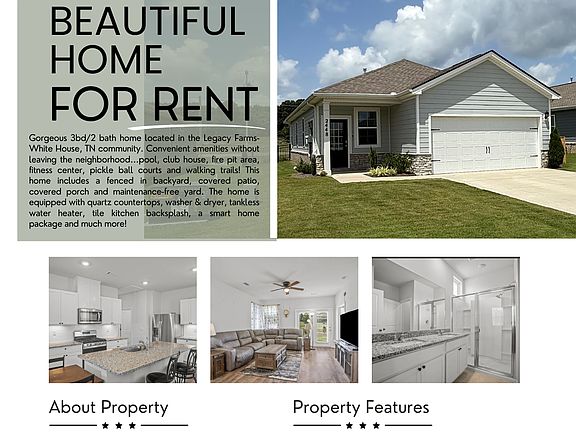 Gorgeous 3bd/2 bath home located in Legacy Farms-White House, TN community. Convenient amenities without leaving the neighborhood pool, clubhouse, fire pit area, fitness center, pickleball courts and walking trails. This home features a fenced in backyard, covered patio, covered porch and maintenance-free yard. This home is equipped with quartz countertops, washer & dryer, tankless hot water heater, tile kitchen, a smart home package & more! Renters are responsible for paying all utilities which includes electricity, water, sewer/trash & gas. 12 month lease No smoking policy No cats Small dogs only (maximum of 1) under 20 lbs with non refundable pet deposit of $250 Lawn care maintenance is included in rent.