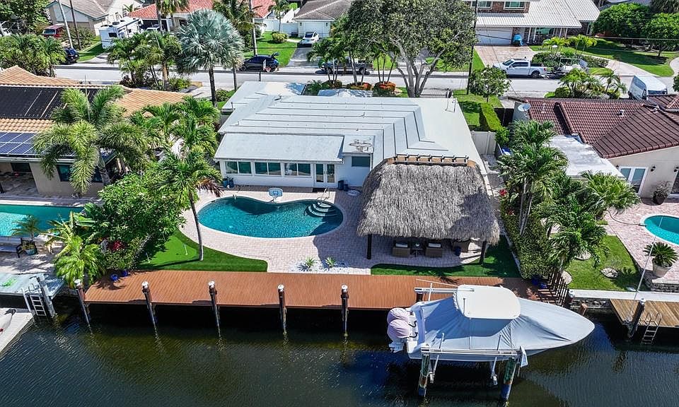 75 ft of waterfront with deep water access and no fixed bridges! NO HOA. This stunning home in the desirable Pompano Isles community is a boater’s dream with direct ocean access just minutes to the Intracoastal. This home features an open floor plan with porcelain tile and marble flooring throughout. The modern kitchen features quartzite countertops, top-of-the-line appliances, and a gas oven and stove. Enjoy peace of mind with impact windows & doors, updated plumbing & electric, and a beautifully resurfaced pool. The primary suite offers views of the pool, with oversized dual shower and double sinks in the ensuite bathroom. Step outside to your private oasis with a new dock, boat lift, and a large tiki hut perfect for entertaining by the water. Near beaches, restaurants & shopping