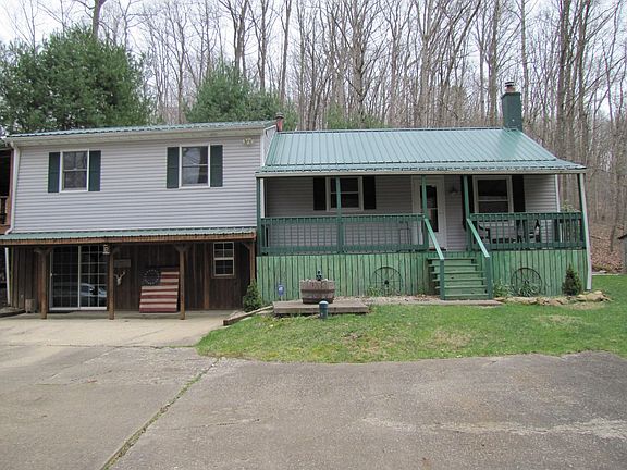 On a dead end road, this 2br (updated) 2bath home sits on 40 wooded, scenic acres. With numerous patio doors, the views are fabulous making it possible to enjoy the outdoors from every room! The great room has newly-tiled and carpeted floors, wood burning fireplace & vaulted ceiling with open beans. It also has a large patio door leading to a 2 tier concrete patio. One bdrm has a patio door leading to a 12x24 covered deck. The walk-out ll family room also has a wbfp and w/ a full bath it could easily be used as the master suite. Beautiful groomed riding trails (wide enough for an ATV) lead to a hilltop camp area with 2 one room cabins. Shelter & large fire pit make it great for small or large groups. There is also a 24x32 pole building w/covered patio.Home comes fully furnished.