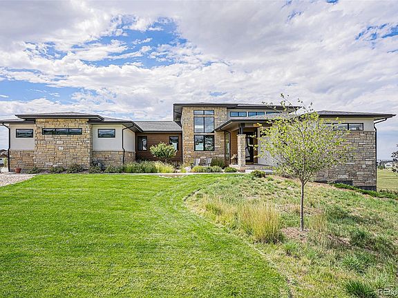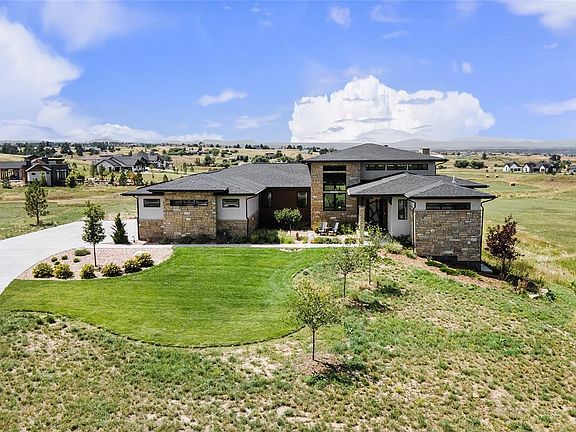 If you are looking for PANORAMIC MOUNTAIN VIEWS of the entire Front Range and a little slice of country with the conveniences of the city nearby, then look no further! This modern prairie home built by Camerata Homes sits on a professionally landscaped 1.59-acre lot w/ plenty of green grass for outdoor play. One of the best lots in the neighborhood, this masterpiece, designed to take in the expansive skies over the entire Colorado Front Range, without looking over roof tops. Step inside this ranch style home and be inspired by the large view-filled windows throughout. The tall ceilings and doors add to the open feel. The gourmet kitchen has a contemporary feel and will delight the most experienced chefs w/ its special amenities featuring standalone refrigerator and freezer cabinets. The expansive pantry is nearly a 2nd kitchen on its own and will become a favorite feature! The kitchen opens to the Great Room and Dining Area and is an entertainer's paradise w/ access to the covered deck from both rooms. This home provides amazing natural lighting as well as an inviting outdoor living space where you will soak up the peaceful feeling of living in Fox Hill. Entering the primary bedroom, you will be greeted w/ expansive views, a gorgeous Spa Bath Suite, and a spacious closet complete w/ a washer/dryer. The split floor plan provides a private dedicated study and a guest ensuite. The 1000 sq ft oversized 3-car garage provides an extended area with storage space. The lower level features a spacious entertainment area featuring a wrap-around wet bar. This room is a perfect man cave, teen hangout, and the best seat for Bronco Sundays! The lower level features a 3rd bedroom with a walk-in closet plus additional space to create a 4th bedroom if desired. This gorgeous custom home has an expansive Exercise Room, or secondary office, and a 2nd Laundry Room. Energy saving Geo-thermal heating and cooling as well as Tesla Solar Panels make living here VERY AFFORDABLE. Welcome HOME!!