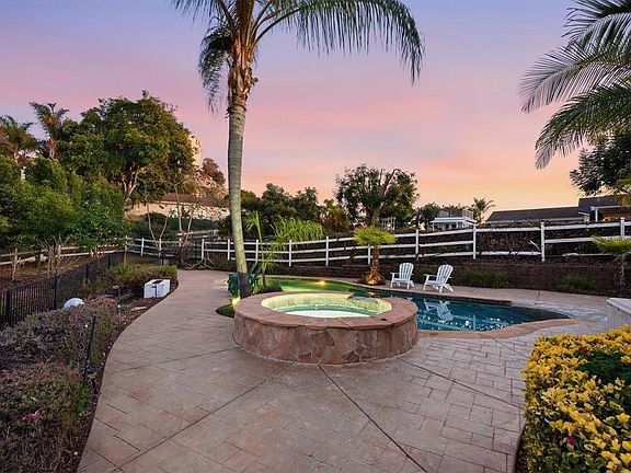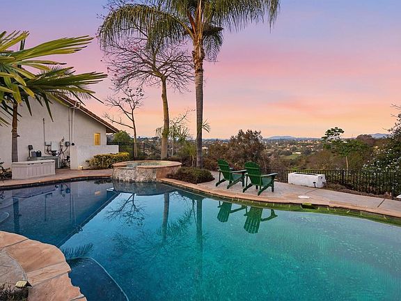 Beautiful custom single-story home, perched on over an acre with panoramic mountain views, fully fenced with a gated entrance in Fallbrooks desirable Olive Hill community. Thoughtfully positioned to capture sunrise-to-sunset vistas, every room is framed by natural beauty, enhanced by abundant windows, plantation shutters, and soaring ceilings. Outside, the sparkling pool and raised spa enjoy a secluded placement with expansive views creating a tranquil backdrop for relaxation or entertaining. The property is fully fenced and includes a separate fenced area, offering the best of country living without sacrificing comfort or convenience. At the heart of the home is the gourmet kitchen, featuring a walk-in pantry, granite countertops, stainless steel appliances, a generous center island, and a large seating bar. A charming breakfast area overlooks the views and opens directly to the patio, perfect for morning coffee or casual poolside dining. The kitchen opens into the family room with fireplace and extends into the formal living and dining spaces, creating an open layout for everyday living and entertaining. The primary suite offers a peaceful escape with its spa-inspired ensuite bathroom, walk-in closet, dual vanities, jetted tub, and separate shower. A private sliding door leads directly to the pool and spa terrace, offering the perfect setting for quiet evenings or sunrise dips. Two additional bedrooms are located nearby, creating a comfortable layout for family or guests and a fourth bedroom, privately tucked away at the other end of the house, features its own full bath, providing the ideal setup for visiting guests, in-laws, or a separate space for work or hobbies. A spacious laundry room with ample cabinetry, counter space, and a utility sink adds everyday convenience. All of this is nestled in Olive Hill, one of Fallbrook’s most beloved communities, known for its natural landscapes, wide-open spaces, and sense of tranquility. Located minutes from Fallbrook village, hiking trails, nature preserves, schools, wineries, and horse trails, this home blends privacy, beauty, and convenience into a lifestyle that feels like a retreat, yet remains close to everything.